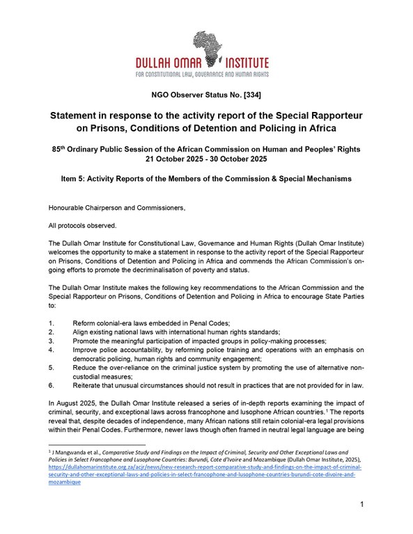 The Dullah Omar Institute for Constitutional Law, Governance and Human Rights (Dullah Omar Institute) welcomes the opportunity to make a statement in response to the activity report of the Special Rapporteur on Prisons, Conditions of Detention and Policing in Africa and commends the African Commission’s ongoing efforts to promote the decriminalisation of poverty and status.