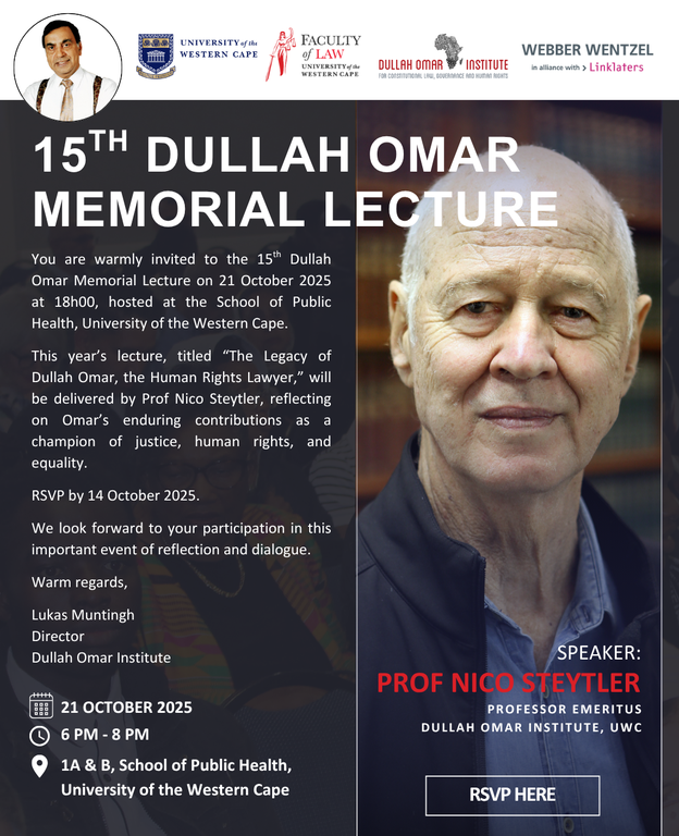 The Dullah Omar Institute and the Faculty of Law at the University of the Western Cape, in collaboration with the Omar Family, are honoured to present the 15th Dullah Omar Memorial Lecture, reflecting on “The Legacy of Dullah Omar, the Human Rights Lawyer.”