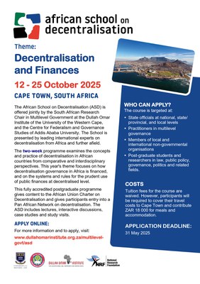 The 5th Edition of the African School on Decentralisation (ASD), themed Decentralisation and Finances, hosted by the Dullah Omar Institute [South African Research Chair in Multilevel Government] at the University of the Western Cape and the Centre of Federalism and Governance Studies at Addis Ababa University, brought together 24 dynamic participants from 10 vibrant African countries for an unforgettable experience from 13–25 October 2025.