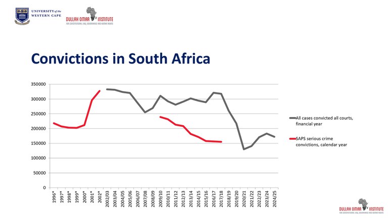 The NPA told Parliament that its conviction rates remain high – most, above 90 percent, which sounds impressive. What it did not say, is that the number of cases the NPA prosecutes all the way to verdict has collapsed over the past two decades — from 300 000 cases in 2004/5 to just 170 000 in 2024/25. The NPA’s reporting to Parliament is built around conviction rates, which are calculated on cases prosecuted to verdict, not on cases that were initially enrolled in court. Because of this, conviction rates tell you nothing about the hundreds of thousands of cases that never get to verdict – that are withdrawn, or struck off, or are closed because the accused stops coming to court after multiple postponements – these categories are the fate of the majority of enrolled cases. Serious commercial crime convictions have fallen to particularly low levels. South Africans are being given a number that looks impressive while the underlying system is in serious decline. We are surprised the NPA is still using these misleading metrics, which continue to incentivise the failure to prosecute, so prominently.